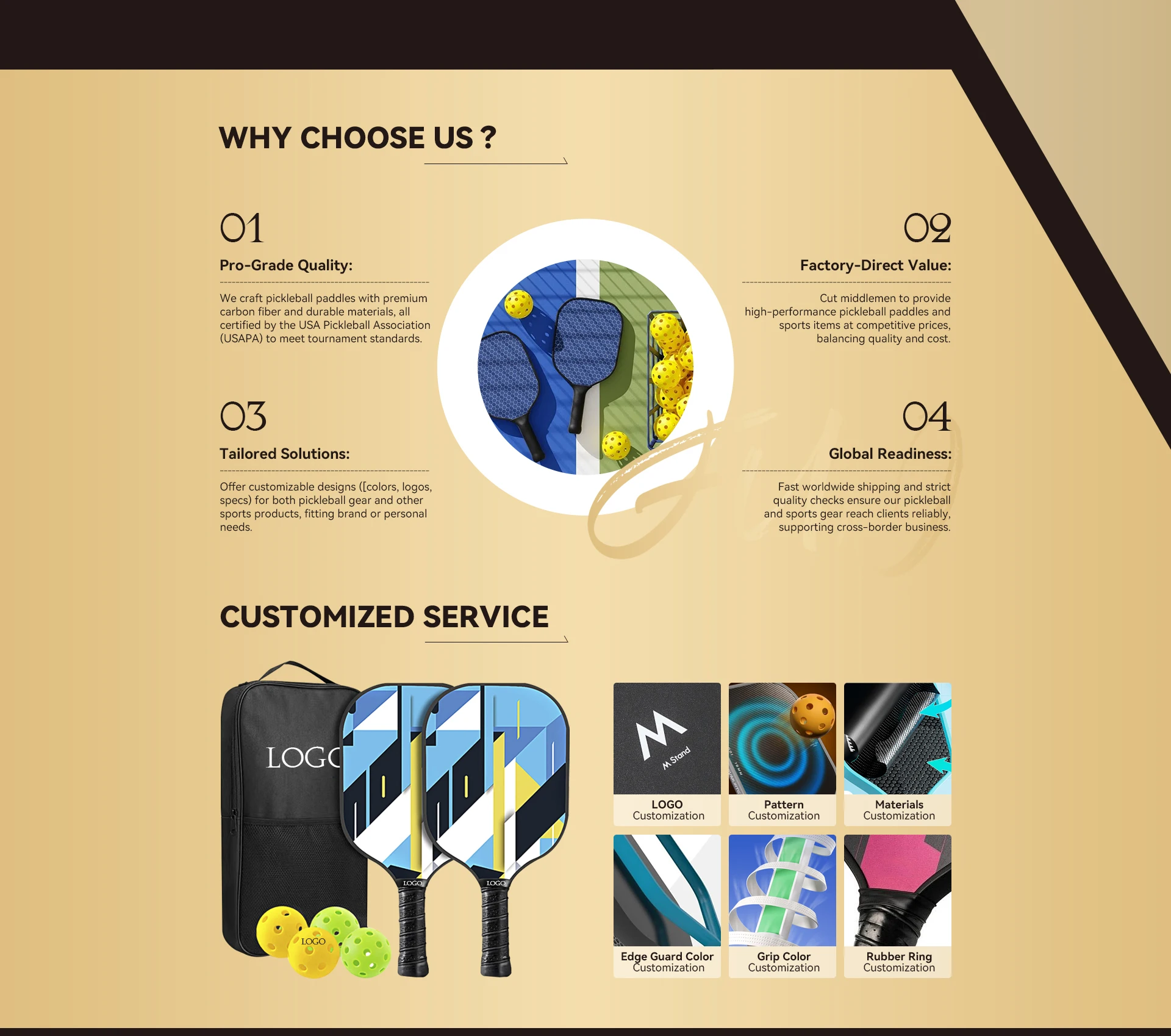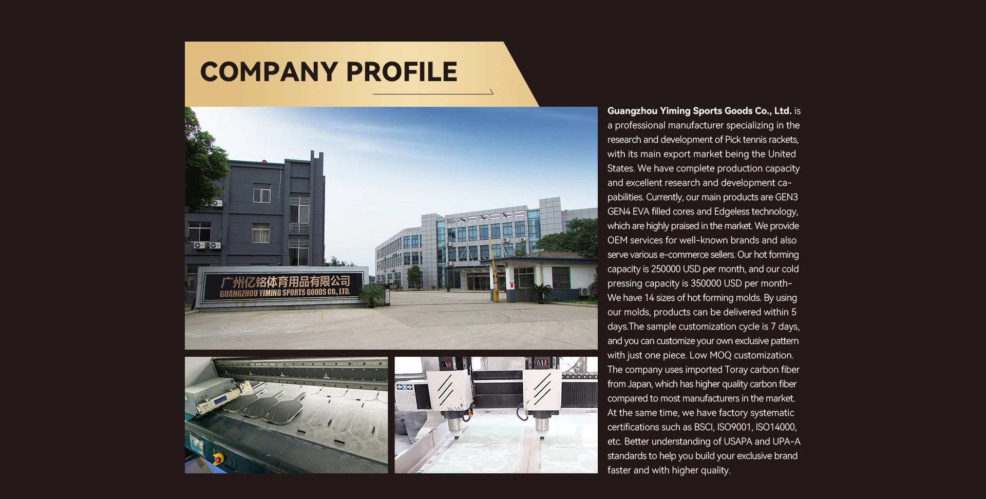 Guangzhou Yiming Sports Goods Co., Ltd. is a professional manufacturer specializing in the research and development of Pick tennis rackets, with its main export market being the United States.We have complete production capacity and excellent research and development capabilities. Currently, our main products are GEN3 GEN4 EVA filled cores and Edgeless technology, which are highly praised in the market.